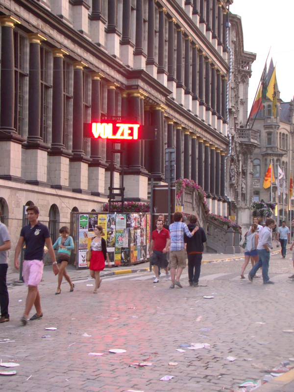 Op weg naar de Vlasmarkt zie ik meer sporen van vandalisme dan op de voorgaande ochtenden tezamen. Het ligt dan ook in de aard van de provinciaal om een spoor van vernieling na te laten. ‘Ik betaal hier geen belastingen, dus wat kan het mij verdommen?’, zo redeneren zij.