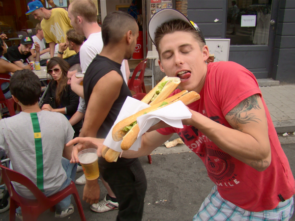Zonen van boerse ouders strompelen in de verkeerde richting naar het centrum. Eén peet, de domste van de bende, raapt een kroonkurkje op en werpt het netjes in een vuilnisbak. Sympathiek. Zijn blik bier houdt hij stevig vast.