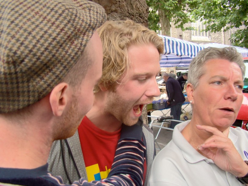 Opeens komt er een sfeerbeheerder bij ons staan. “Je aanrander staat hier opnieuw. Het is de grootste beer van de Vlasmarkt en hij is nog zeer agressief”, zegt de sfeerbeheerder tegen de ontbijtende jongeling. “Ga alsjeblief weg, wij kunnen hem niet onder controle houden.”