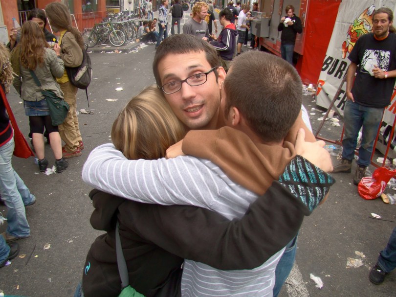 Uiteindelijk zetten we ons een halfuur later toch in beweging. “Het is nog altijd veel te vroeg”, sakkert Matthias. Maar zijn verzet baat niet, de groep heeft besloten om tussen het volk te staan, en tussen het volk zullen we staan.
