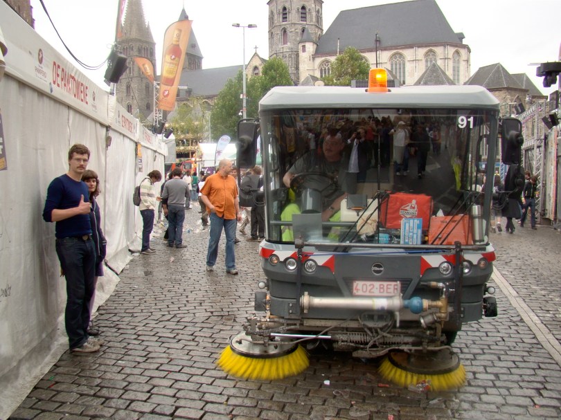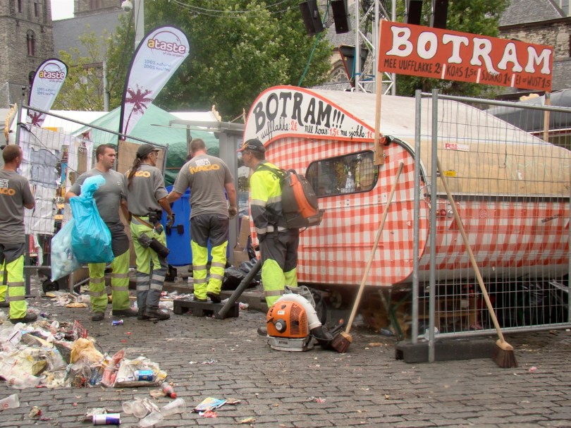 Het is mooie kennis om te vergaren op de laatste ochtend van de Gentse Feesten. Graag had ik er nog wat langer van genoten, op mijn plein, tussen de personages en de figuranten van mijn verhaal, maar daar komen de wagens en de machines van Ivago alweer aangestoven, met in hun kielzog een tiental journalisten en fotografen. Ons afval, dat we gedurende tien dagen met zoveel overtuiging tussen de kasseien hebben gestampt, wordt losgewrikt en weggevoerd. Geüniformeerde mannen deporteren onze vuiligheid naar de verbrandingsoven.