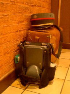 Een conducteur heeft zijn attributen tegen de muur geplaatst terwijl hij aan de toog een koffie drinkt voor zijn shift begint.