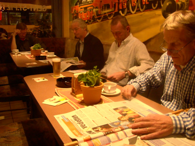Zonder aarzelen volg ik hem. Tot mijn verbazing zitten er reeds zeven andere klanten. Eentje drinkt bier, de anderen houden het bij koffie.
