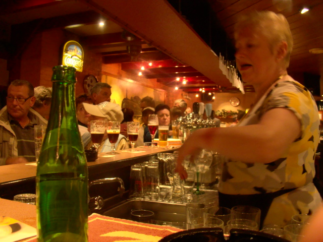Er is gelukkig nog ander bier, zoals Rodenbach, Westmalle, Chimay en witbier. Ik behelp me met een dubbele Westmalle. Een dame die hier al bijna tien jaar vaste klant is, komt me feliciteren met mijn reportage.