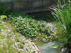 De grote waternavel is een verschrikkelijke plant. Ze heeft de neiging om water oppervlaktes te overwoekeren. In haar gebied van oorsprong doet ze dat niet omdat het water daar voedselarm is en er meer schaduw is. (Foto KULAK)