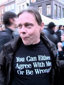 Ondertussen is op de dj-toren een halfslachtige striptease-act gaande. Een blonde vrouw heeft zich ontdaan van haar T-shirt en zwaait wild met d’r lange haren. Eén keer flasht ze een blote tiet, maar veel meer is er niet aan. “Kun je geloven dat er nu vrouwen klagen dat dat plat en vulgair is?”, zucht mijn voornaamgenoot Tim V. “Oké, het is misschien een beetje plat, maat dit is nog altijd de Vlasmarkt. Het mag hier best wel een beetje kinky zijn.”