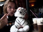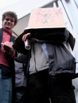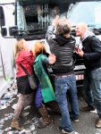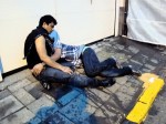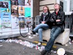 Samen met z’n kompaan Youri zet hij zich even neer op een betonblok. Na acht dagen feesten begint de vermoeidheid te wegen. “Ik zit hier ook maar als weerloos zoogdier”, verdedigt Kevin zichzelf.