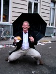 Op den duur schieten we nog maar met een handvol diehards over op de Vlasmarkt – het groepje rond Kevin en Anne-Marie is verdwenen in de nevelen der legenden. Gerald Claeys van de Charlatan, the boss of it all, komt bij ons staan. “Wat wij hier doen, is uniek in de wereld. Tien dagen lang tot acht uur ’s morgens feest, waar elders vindt ge dat?”, vertelt Gerald trots. Van het slechte weer van de voorbije week trekt hij zich maar weinig aan. “De regen heeft ervoor gezorgd dat meer Gentenaars naar hier kwamen. Er was meer samenhorigheid. De regen is een externe factor: iedereen wordt nat. Dat verbindt de mensen met elkaar. Noem het voor mijn part God.”