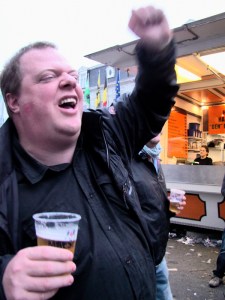 Toch zal Kevin niet plooien. Vanuit de achtergrond duikt hij plotsklaps op met twee handen vol pintjes. “Je moet niet weglopen voor de feiten, Tim!”, zegt hij als hij er mij eentje in de pollen steekt. Alzo voorzien van bier horen wij hoe de dj zijn set afsluit met een nummertje van de betreurde Amy Winehouse. Tot sentimentele taferelen leidt dat gelukkig niet, of ik was naar huis.