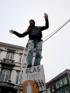 De dj speelt het magistrale ‘Popcorn’ van Hot Butter en ik ontwaar een zweem van surrealisme op de deinende Vlasmarkt. Op dat moment kruipt een zekere Bart op een glasbak om vervolgens een straf staaltje evenwichtstechniek tentoon te spreiden. De massa juicht en brult. Even is Bart een ster. Dat hij zich lelijk bezeert als hij weer naar beneden kruipt, zien de meesten niet.