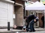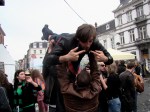 Opeens explodeert er een aansteker. PLOF! Eén jongeman krijgt het projectiel in z’n gezicht. We maken hem wijs dat zijn rechteroog weg is. Het duurt even – een seconde of zo – voor hij beseft dat we hem in de maling nemen en dat hij slechts een klein wondje aan z’n wang heeft.