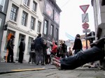Een feestvierende dame schrobt mee de vuile Vlasmarkt schoon.