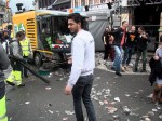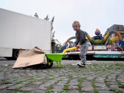 Een ventje helpt mee de kermis op de Vrijdagmarkt afbreken. Hij heeft een grote toekomst in de afbraaksector.