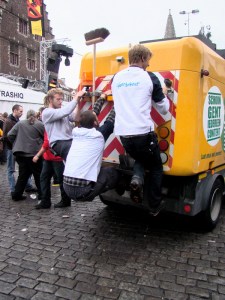 Halverwege mijn dagelijkse tocht kom ik zo’n wrak tegen. Een kale man van eind de vijftig met een troebele blik. Z’n mond hangt half open, af en toe bazelt hij een onsamenhangende klank. Een behulpzame dame houdt hem recht. Allez vooruit, denk ik, burgemeester Daniël Termont heeft zich op de laatste avond precies ook geamuseerd. Even overweeg ik een foto van de wankele politicus te maken, maar tegen dat ik mijn toestel klaar heb, is de burgemeester al te ver weg gestrompeld. Dat is maar best, zo.