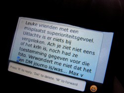 Ik hou van dergelijke berichten. Er valt makkelijker mee om te gaan dan met lof. Op lovende woorden kun je nooit gepast reageren, tenzij door beaat te glimlachen en te hopen dat het snel voorbijgaat. Negatieve kritiek is een stuk plezanter, ook al omdat ze dikwijls veel oprechter is. Het is goed voor mijn eigenbeeld dat mensen mij wijzen op mijn superioriteitsgevoel, al begrijp ik niet wat er zo misplaatst aan is. Wat ik ook niet goed begrijp, is waarom die mens zich boos maakt over een foto waarop de genaamde ‘krln’ blijkbaar niet eens te herkennen valt. Moet ik dan zonder toestemming een foto publiceren waarop ze wél herkenbaar in beeld verschijnt? En laat ons wel wezen: voor uitlachjournalistiek ben ik een veel te brave jongen. Af en toe een onnozel mopje, meer moet je niet van mij verwachten.