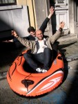 Twee rafters verlaten onder luid gejoel en geproest de Vlasmarkt. Waar zij zullen aanspoelen, weten ze nog niet, maar de goot is beslist een veilige gok.