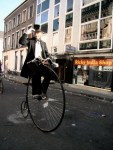 Vanuit het schimmenrijk komt er opeens een negentiende-eeuwse fietser aangereden. Onze stomme verbazing brengt hem niet uit zijn evenwicht.