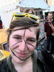 Ondanks haar merkwaardige make-up kan deze dame haar glanzende reeënogen niet aan de aandacht onttrekken.