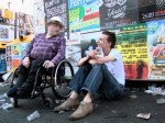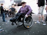 Een man zonder rolstoel moet noodgedwongen opkijken naar Alain, die het niet gewend is uit te torenen boven zijn gesprekspartners.