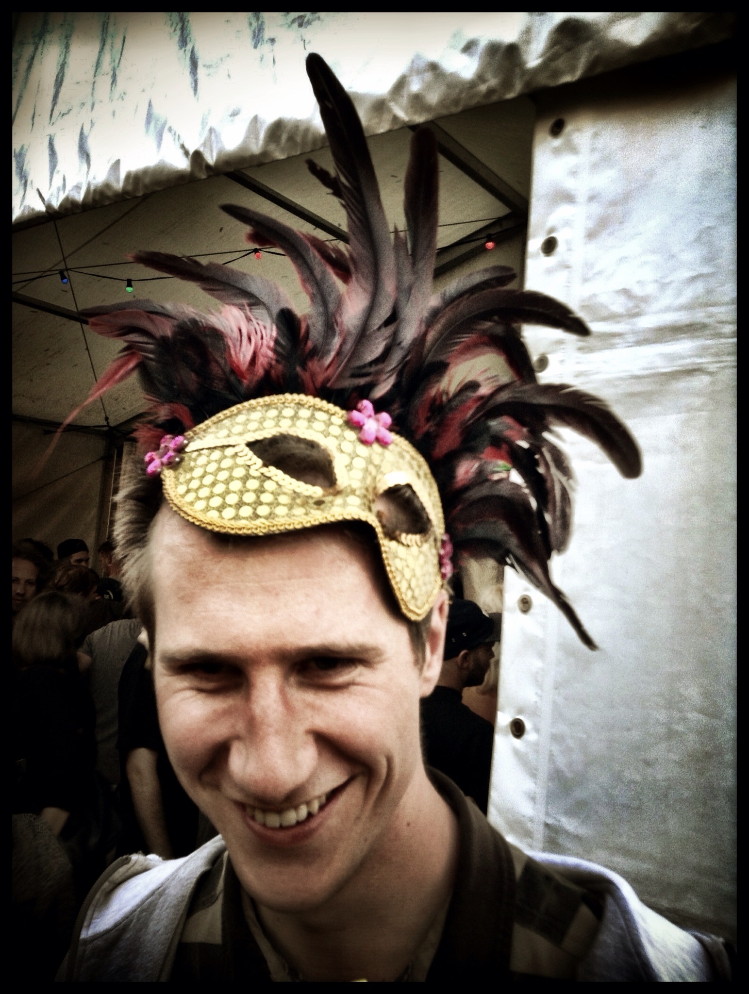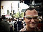 Om toch een beetje vrolijkheid in mijn ochtendlijke nacht te brengen, maak ik een praatje met een man die een soort led-bril draagt. De lichtjes zijn naar binnen gekeerd. Raar ding.