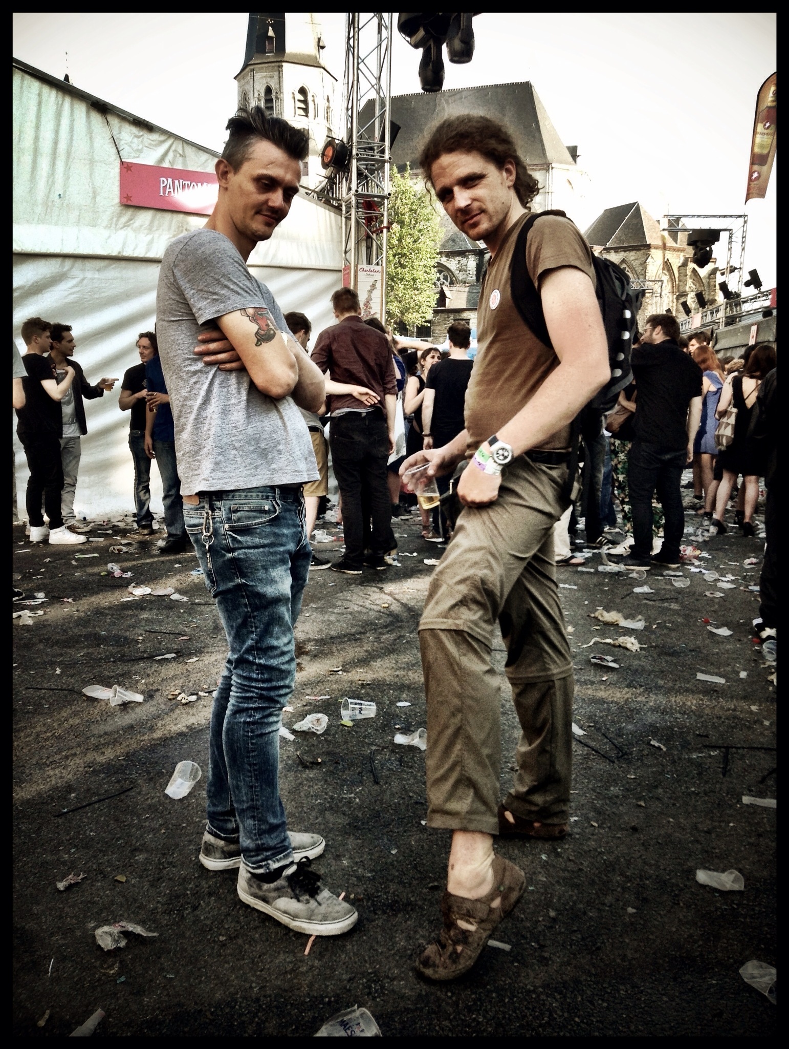 De Feestengangers die nog een laatste pintje willen, zakken af naar Sint-Jacobs, waar de traditionele afterparty plaatsvindt. Zittend op het trottoir kom ik er Ruben tegen, die vandaag géén mascara in zijn snor gewreven heeft, in tegenstelling tot gisteren. Met fonkelende ogen bekijkt hij de jongedames die met hun kont staan te draaien.