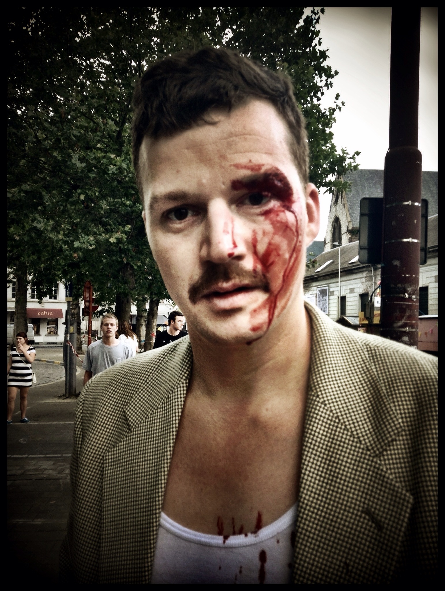 Straks wordt hij genaaid en hij zucht dat het nu al de derde keer is dat hij het einde van de Gentse Feesten met een blauw oog zal meemaken. Doordat hij tijdig behandeld wordt, hoeft hij niet te vrezen dat de dokters zijn gezicht moeten amputeren.